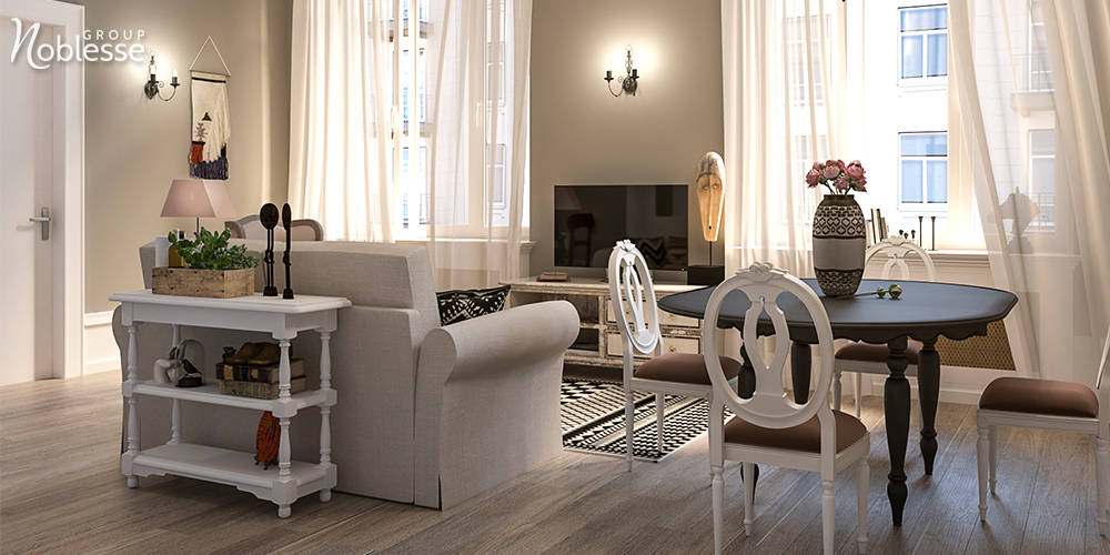 In zona de zi sunt prezente ferestrele de mari dimensiuni care par sa invite soarele inauntru iar zona este mult mai aerisita si mai luminoasa. Mobilierul care face parte din aceasta amenajare interioara il vei putea regasi in portofoliul Noblese Group. Piciorele mesei de dining sunt elegante si ne aduc aminte de vacantele din casa bunicilor.